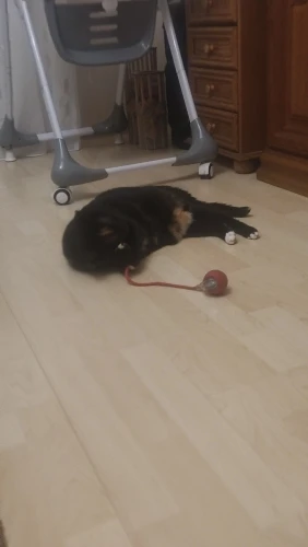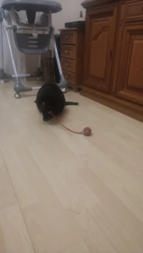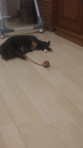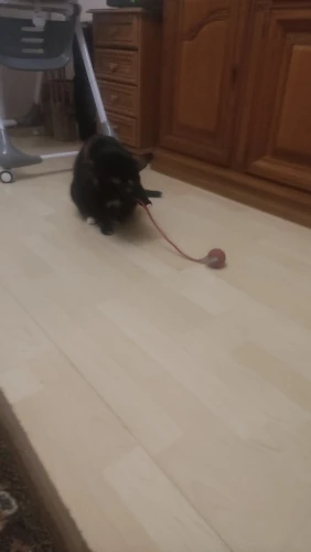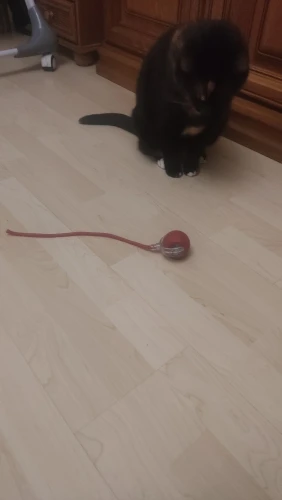 Das Spielzeug verursacht großen Interesse an der Katze. Die Katze ist nicht mehr ein Teenager, folgt dem Spielzeug aber sehr gerne.